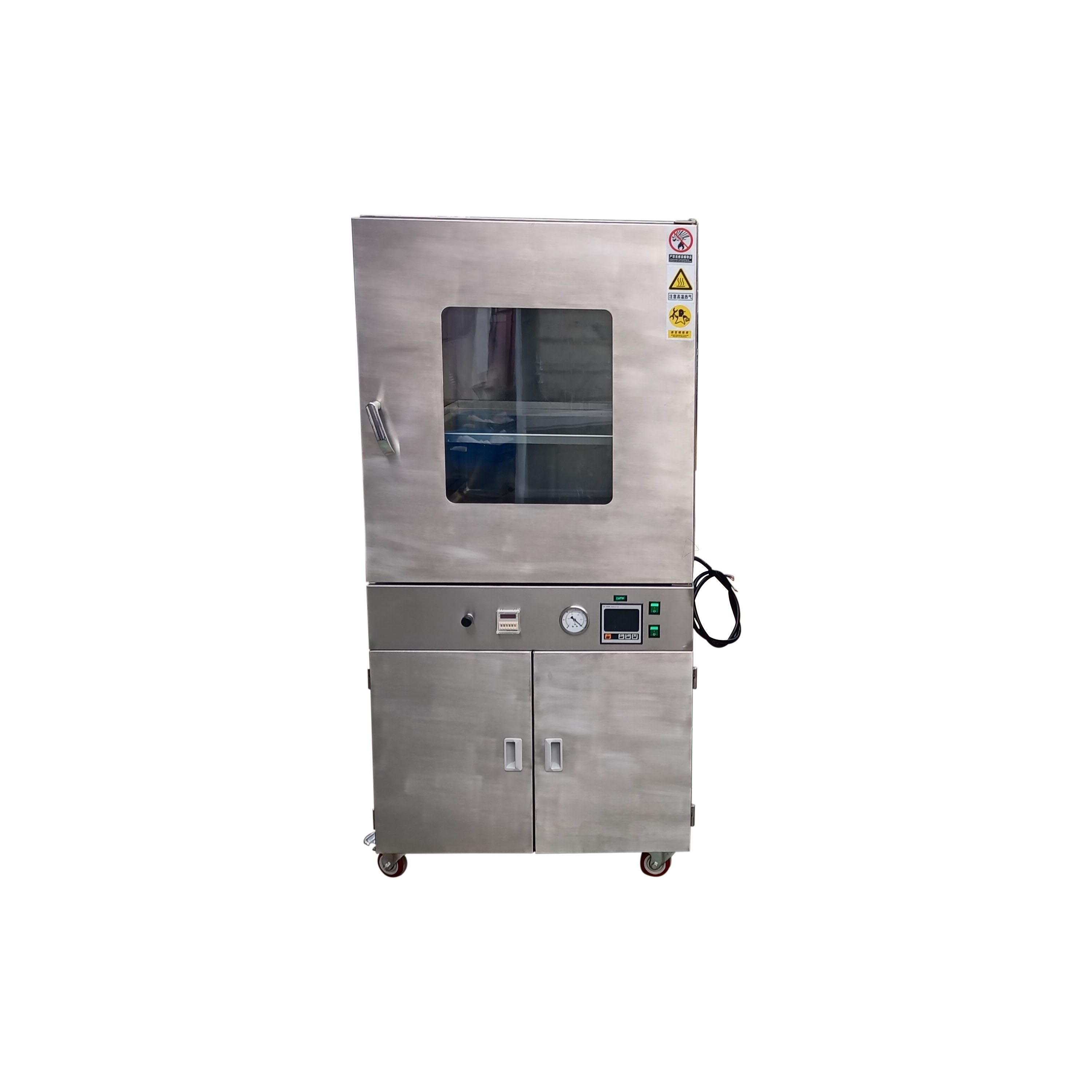 2. 工作室與玻璃門之間裝有一次性澆注成形耐高溫硅橡膠門封條有效密封,以保證箱內(nèi)達(dá)到較高的真空度。