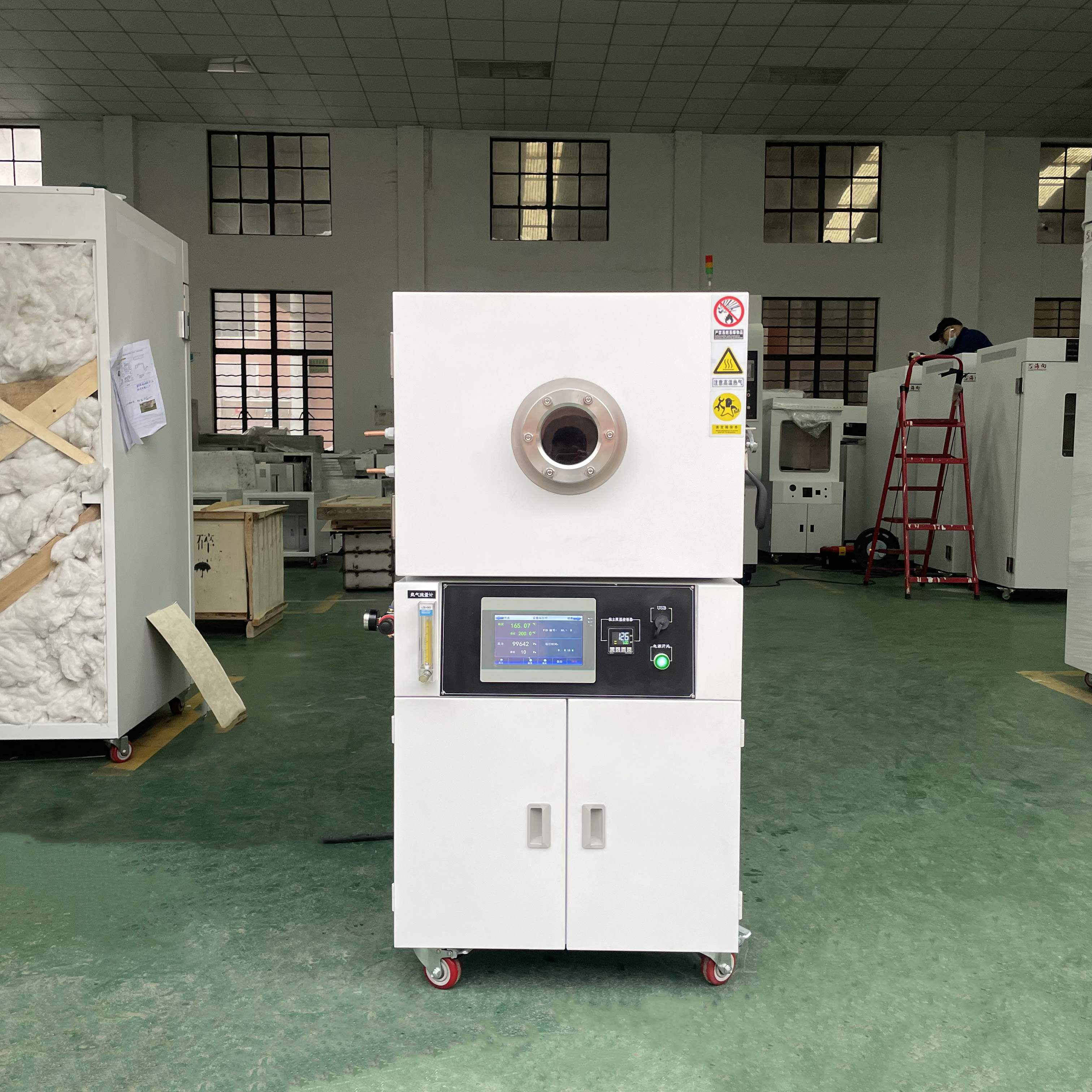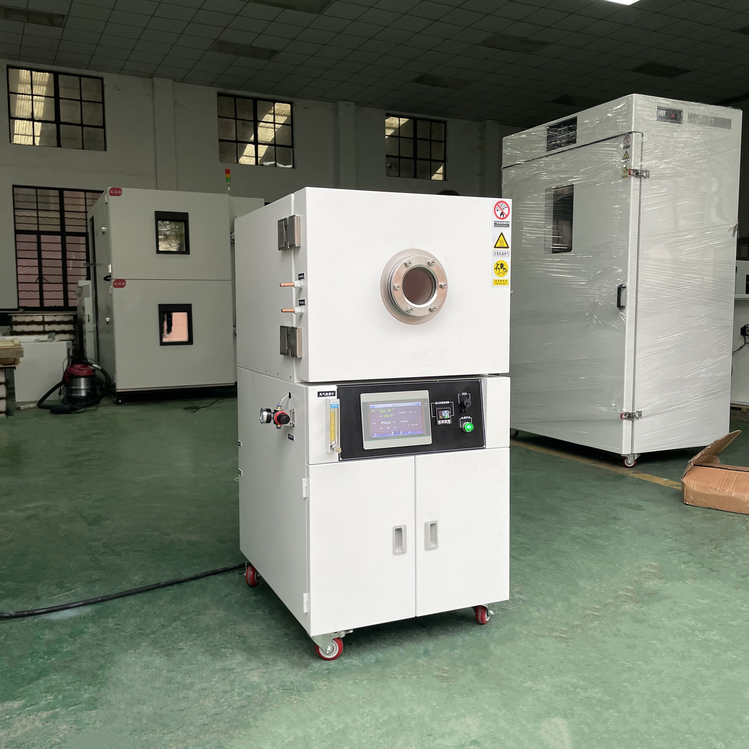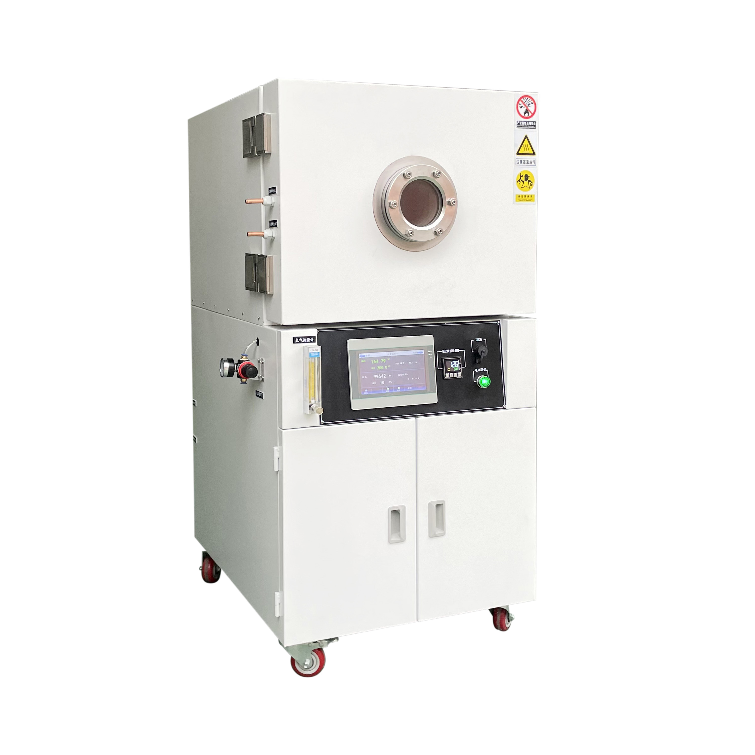 8. 立式結構,上部為腔體工作室,儀表中部,真空泵放在下部下箱柜,門上有圓形視窗