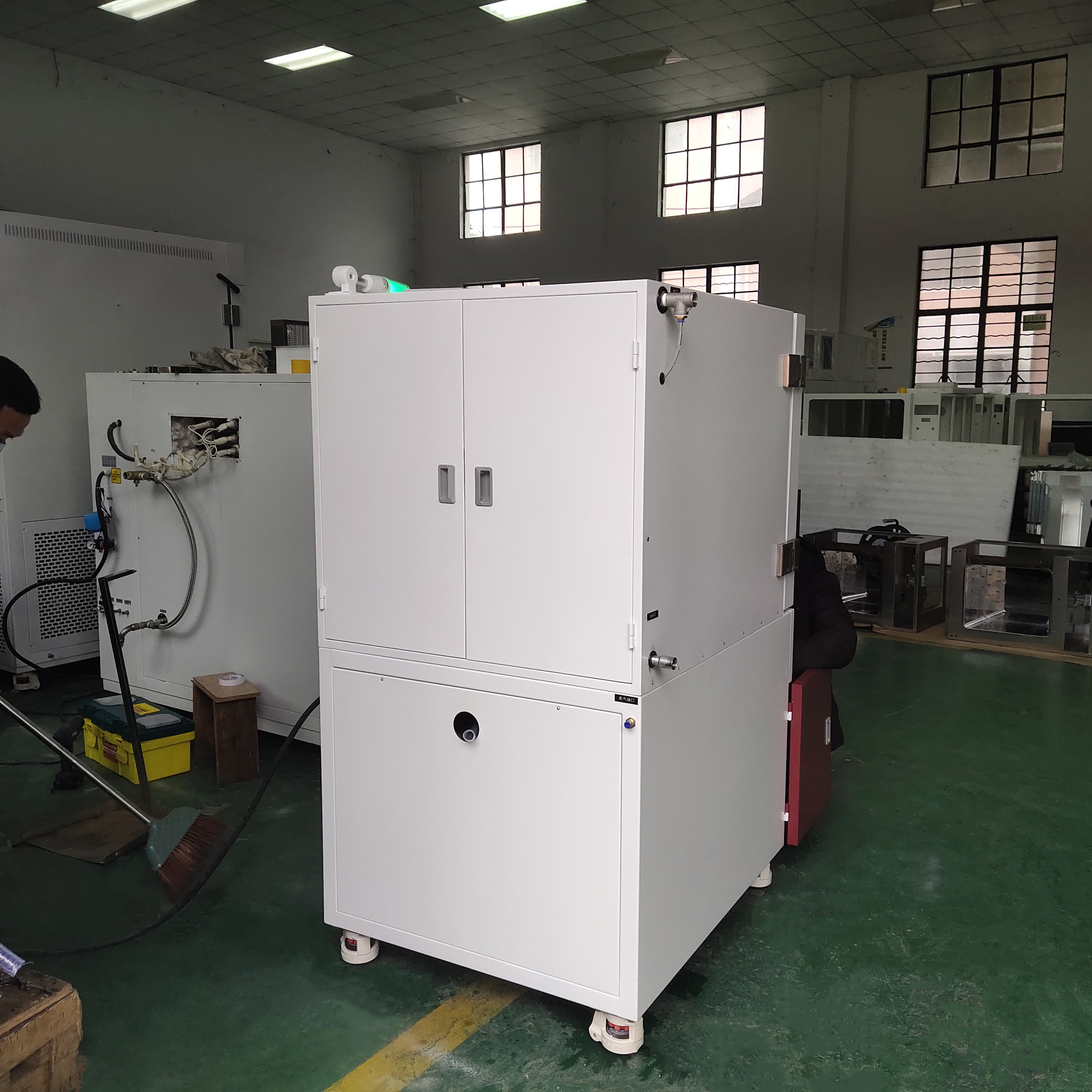 立式結構,腔體在上部,腔體內有循環風機加熱管,冷卻管道風道板,儀表在中部,底部真空