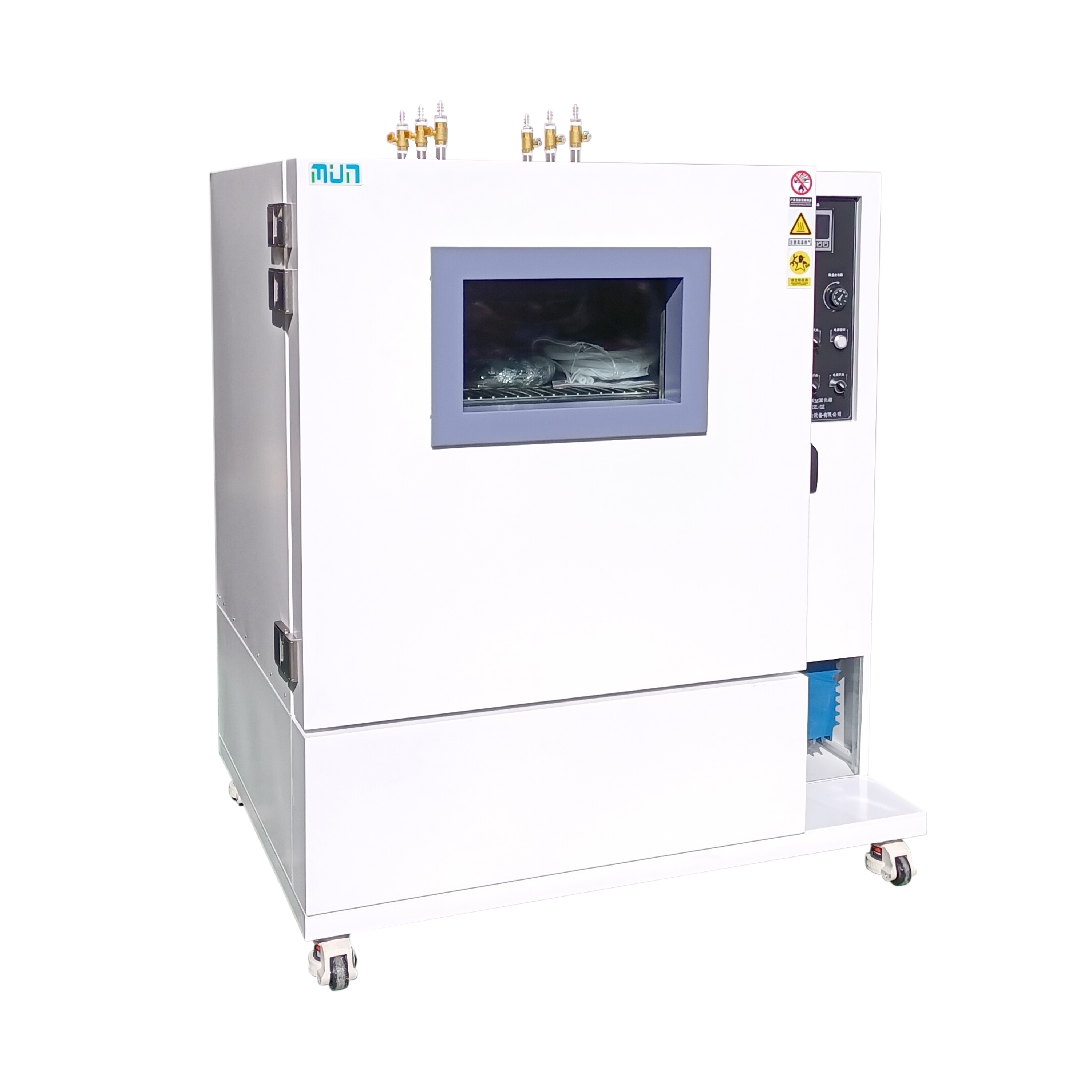 2.工作室與門之間裝有一次性澆注成形耐高溫硅橡膠門封條有效密封,以保證箱內達到較高的真空度。