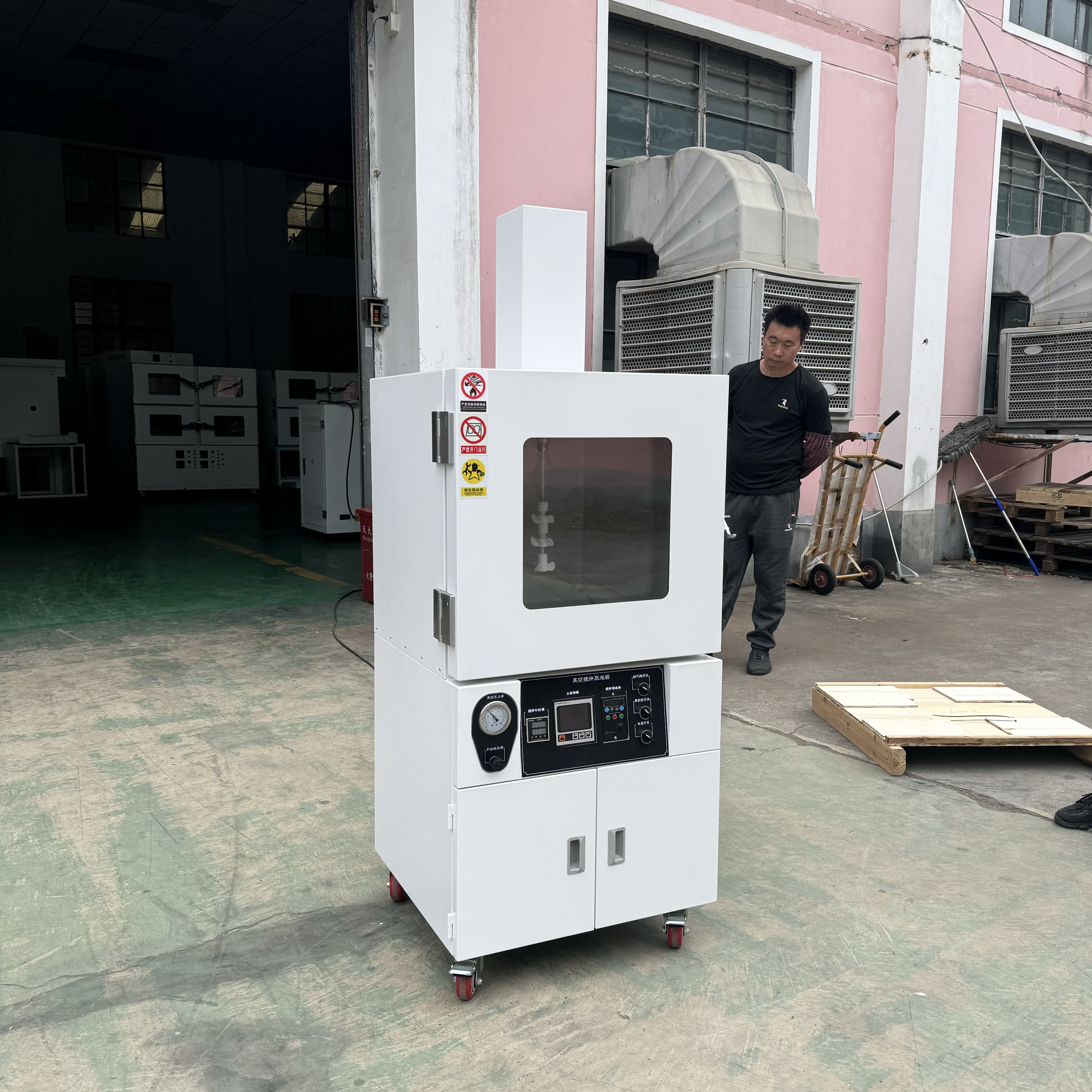 1.立式結(jié)構(gòu),腔體在上部,儀表在中部,真空泵在下部,底部移動(dòng)腳輪