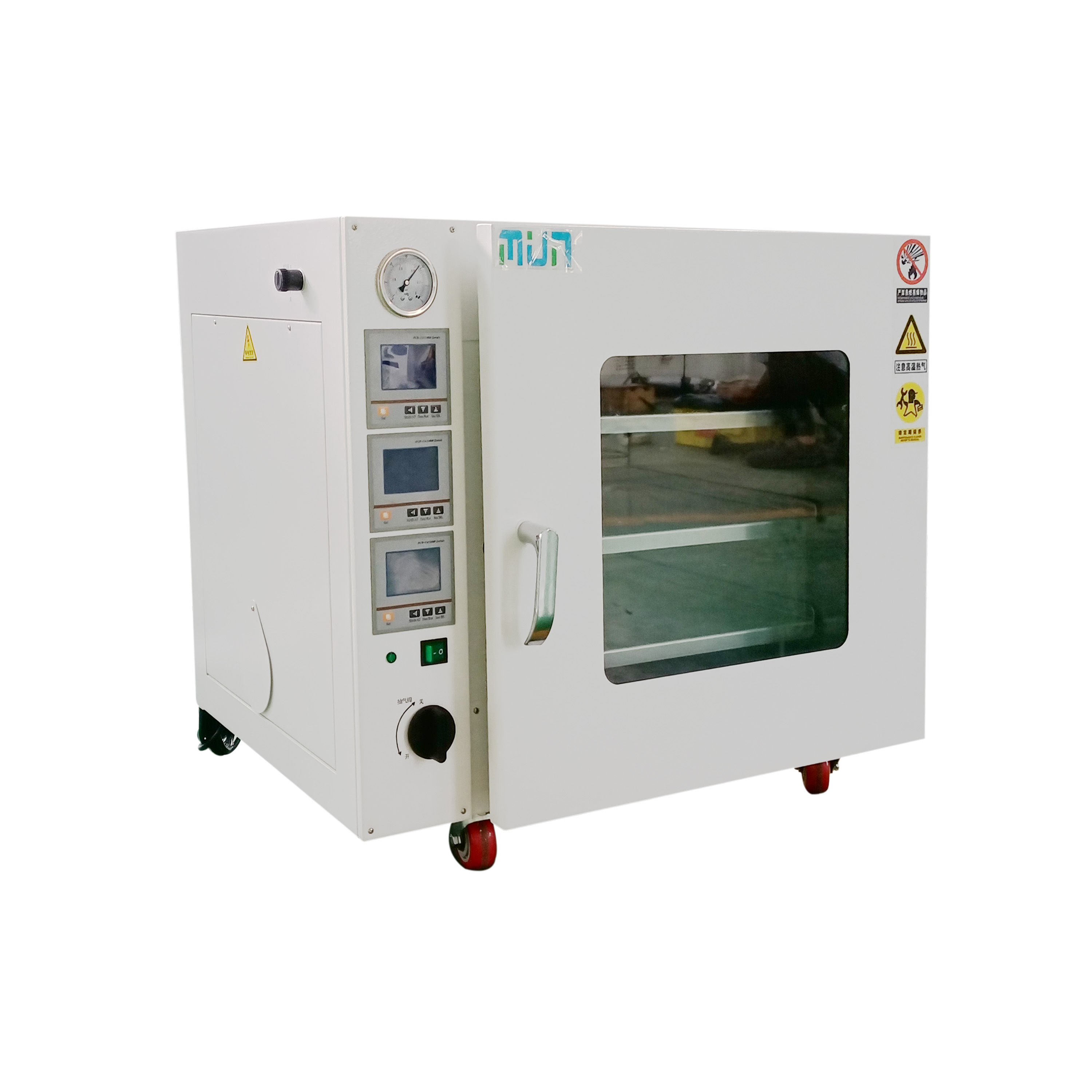 2. 工作室與玻璃門之間裝有一次性澆注成形耐高溫硅橡膠門封條有效密封,以保證箱內達到較高的真空度。